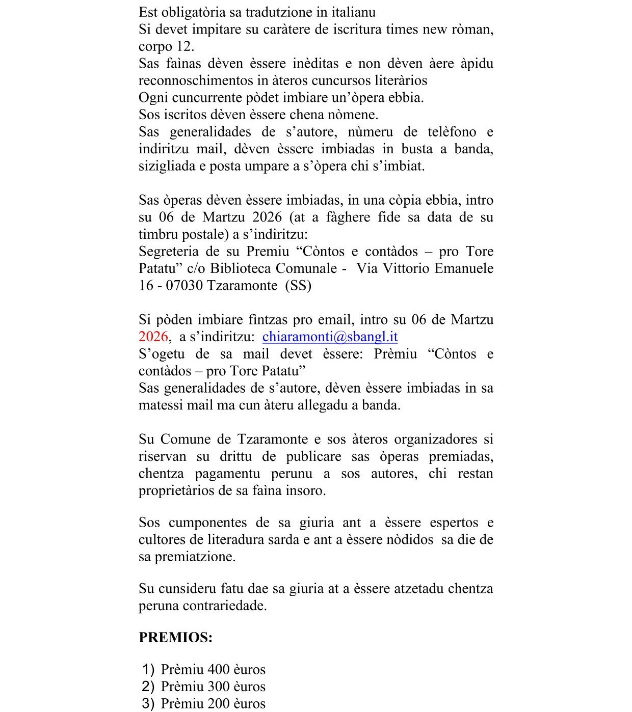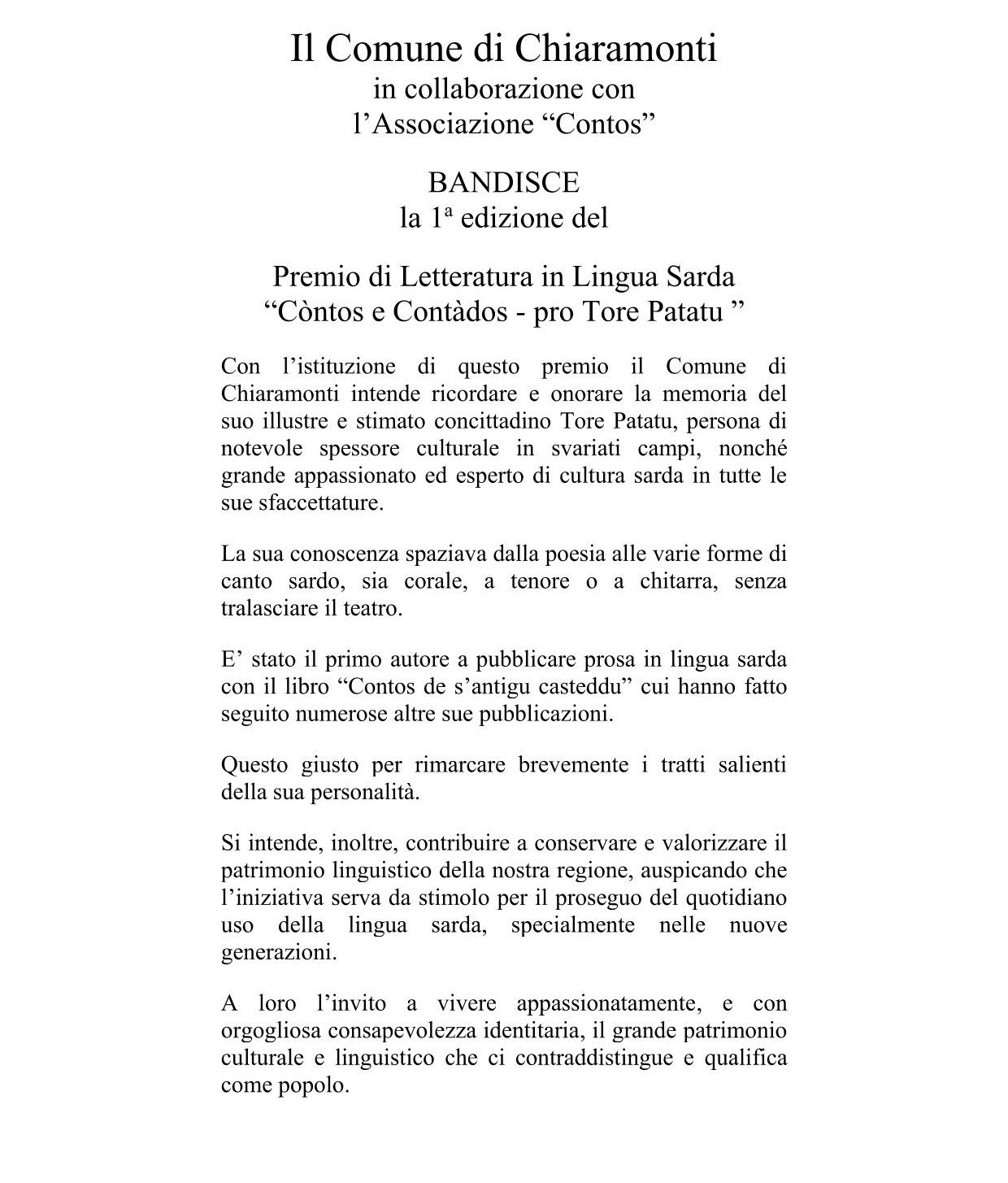 Premio di Letteratura Sarda "Còntos e Contàados" per Tore Patatu