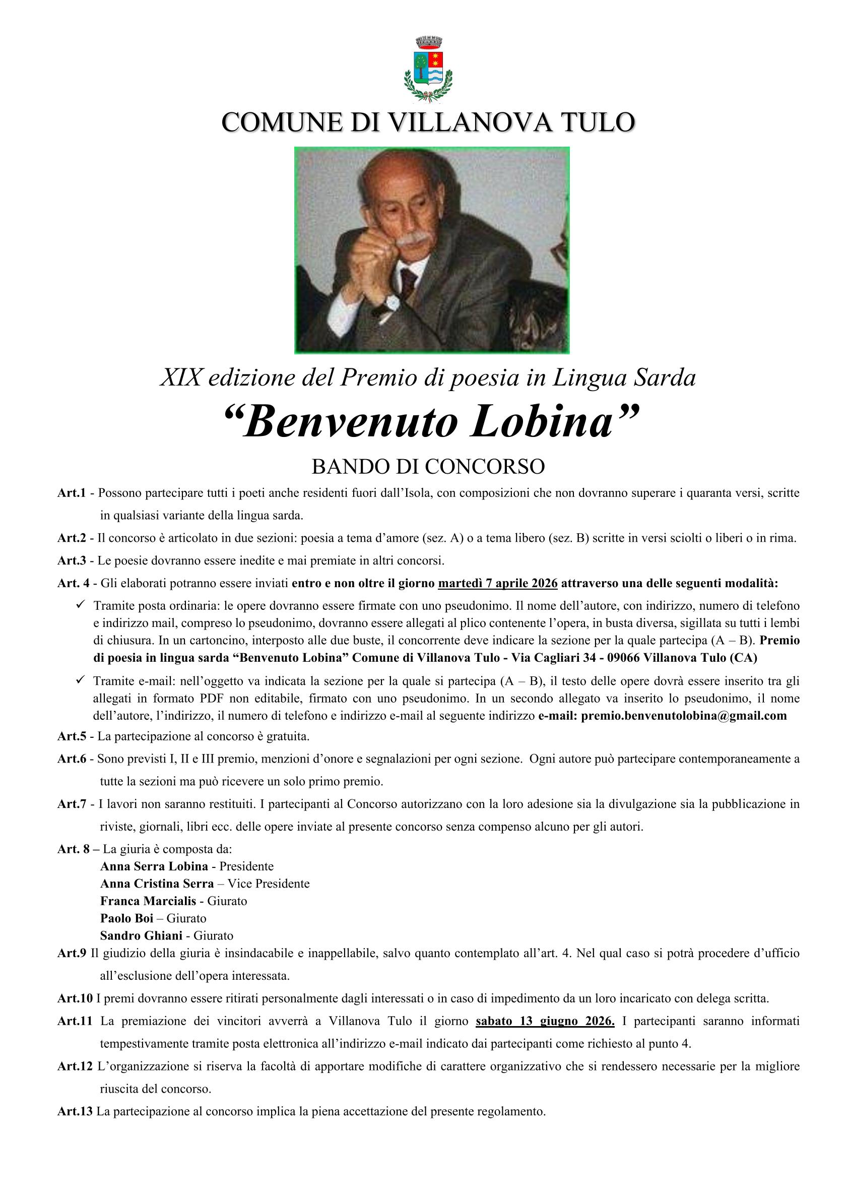Per scaricare il regolamento in pdf clicca nel link di sotto: XIX Edizione del Concorso Premio di Poesia in Lingua Sarda