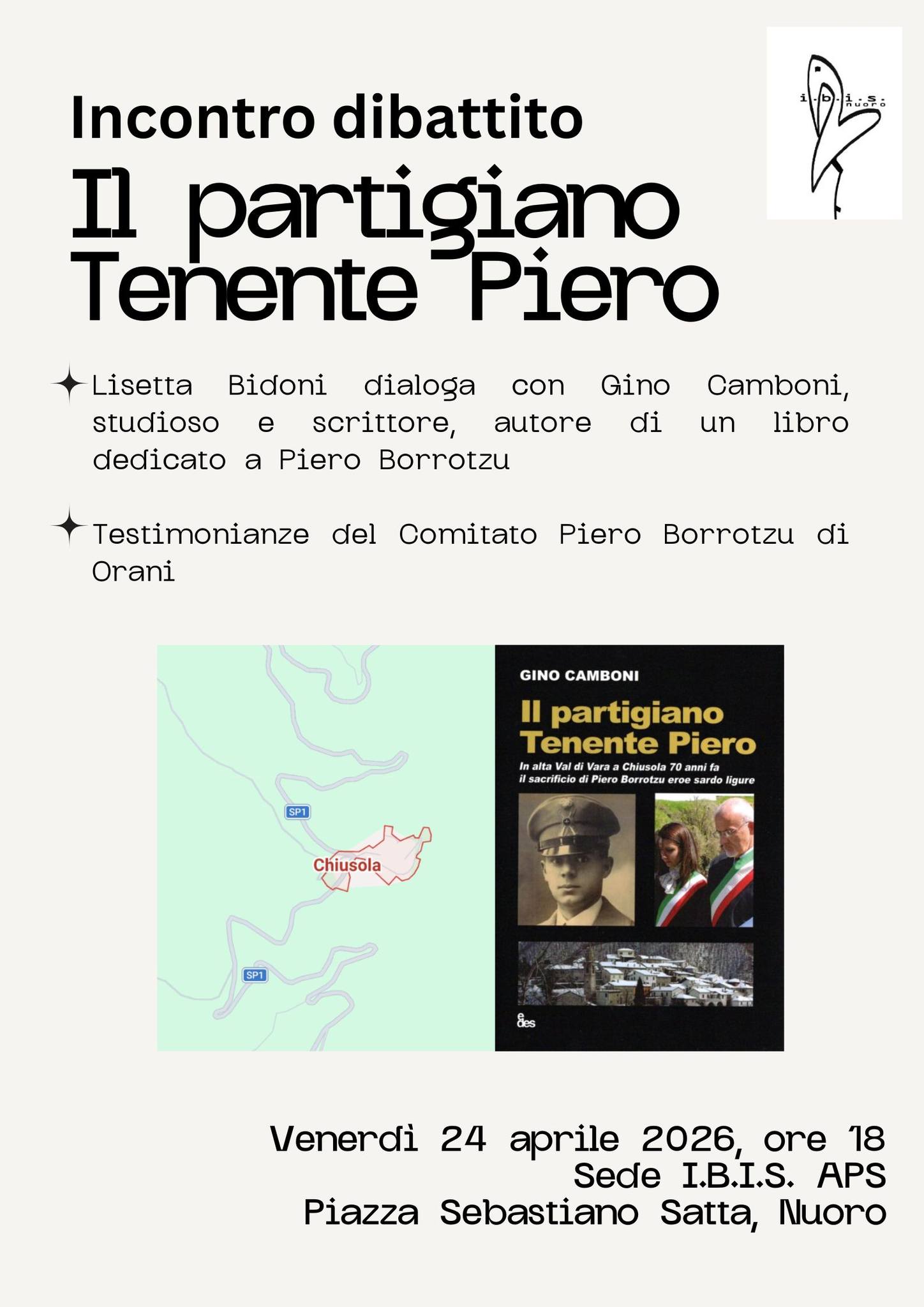 La vicenda del partigiano è narrata in un libro di Gino Camboni che dialogherà con Lisetta Bidoni. Alla serata IBIS partecipa, portando testimonianze, il Comitato Piero Borrotzu di Orani.