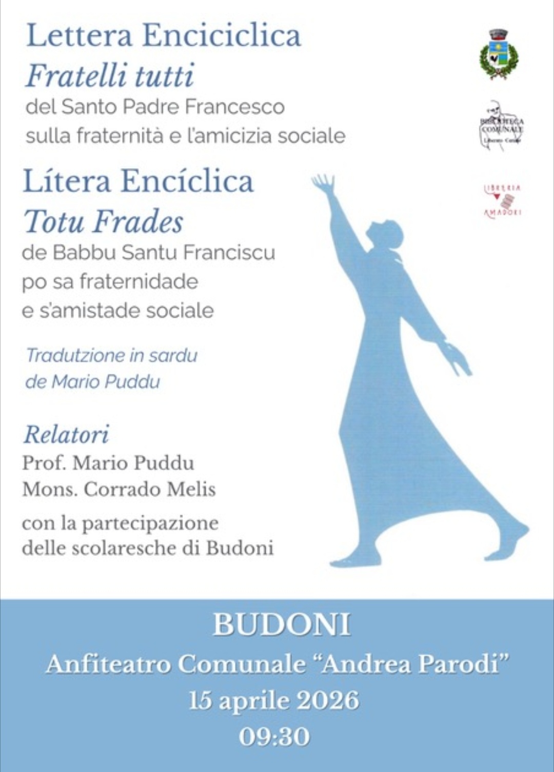 Fratelli Tutti, la terza Enciclica di Papa Francesco, tradotta in limba con il titolo Totu Frades (Ediz. Condaghes, 2021), rappresenta un ideale e fondamentale appello alla fraternità e amicizia sociale; l'opera, un messaggio globale per una cultura di pace e di vita, verrà presentata a Budoni, presso l'Anfiteatro Comunale “Andrea Parodi”, il 15 aprile 2026 alle ore 09.30, con la partecipazione delle scolaresche locali. Cristoforo